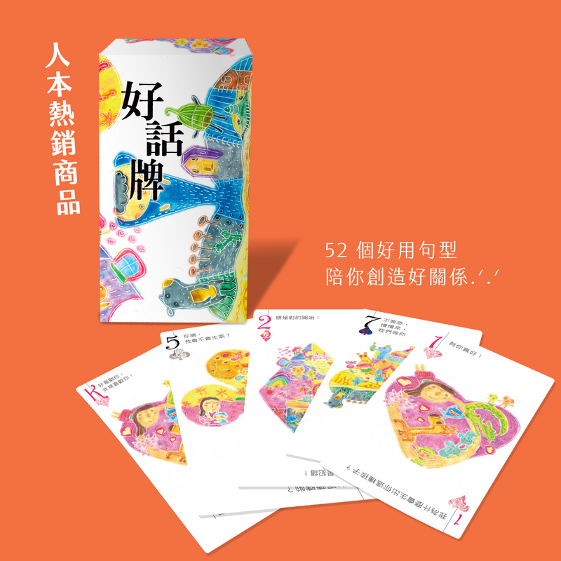 撲克牌形式的好話牌,精選52句「好話」,提供好思維、好句型,給予生命正向力量。以正、負話並列呈現,透過翻轉的張力,讓人體會、掌握「好話」的力量。 讓人一邊玩牌,一邊把心打開,生命將有最好的安排!看好話,說好話,讓「家」成為孕育愛,讓人信心滿滿的地方